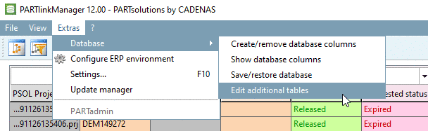 %CADENAS_SETUP%/plinkcommon.cfgunder the sectionADDITIONALTABLES.[ADDITIONALTABLES] #:VALS_S #:HELP;default;this table is used to store references concerning PLM-systems t0=PLMTABLE #:VALS_S #:HELP;default;this table is used to store Assembly-structures with ERP-information t1=DATATABLE #:HELP;default;this table is used to store project-specific data (ie. project specific partnames for CAD-files) t2=PLMTABLE2