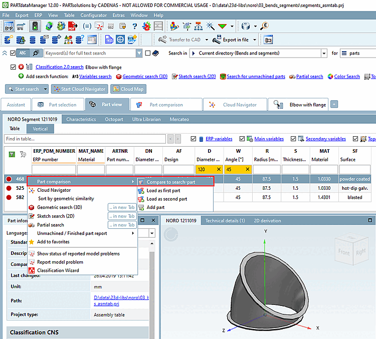 9. Pour effectuer une comparaison de composants avec la pièce de recherche (ou d'autres pièces entrant en ligne de compte), sélectionnez la ligne souhaitée et appelez la commande Comparer avec la pièce de recherche [Compare to search-part] dans le menu contextuel.