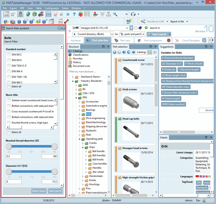 When selecting a directory in the structure tree (for example Standards -> ISO -> Bolts) then on the tabbed page Suggestions, the common variables of this directory level are displayed.