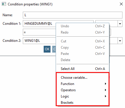 Dans le champ Condition 1 ou Condition 2, vous pouvez non seulement effectuer des saisies manuelles, mais aussi placer des noms de formules ou de variables. Le menu contextuel (bouton secondaire de la souris) offre de nombreuses possibilités :