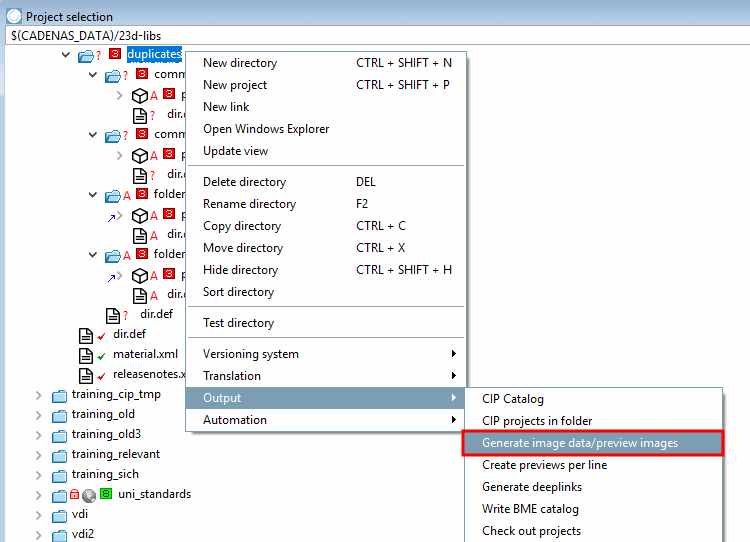 Dans le répertoire souhaité (répertoire principal du catalogue ou sous-répertoire), exécutez la commande Générer des données d'images/prévisualisations [Generate image data/preview images] sous Sortie [Output].