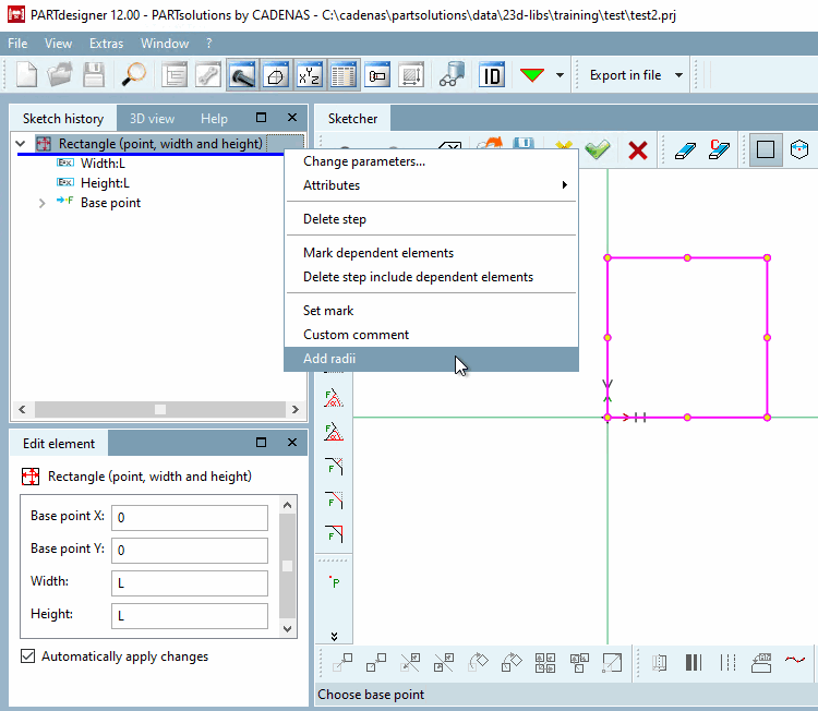 Sélectionner l'objet à arrondir dans l' historique de l'esquisse [Sketch history].