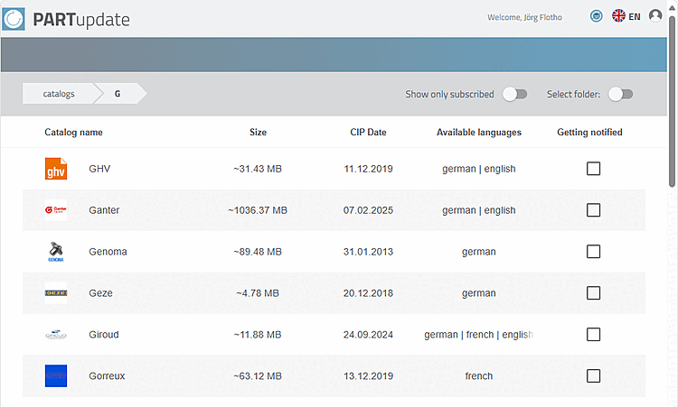 Dès que vous êtes connecté, PARTupdate s'ouvre. Sous "catalogs", vous trouverez les catalogues, les classifications et les informations sur les filetages, sous "isos" différents progiciels.