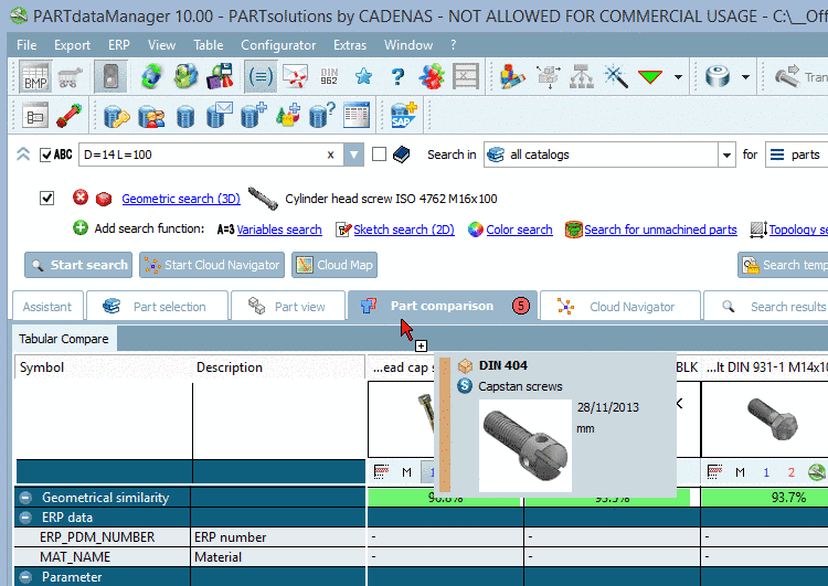 You can fetch parts from the Part selection -> Symbols/Details or tabbed page Search results into the Part comparison by drawing them on the tab of part comparison. Furthermore there, the current number of parts in the comparison is displayed.