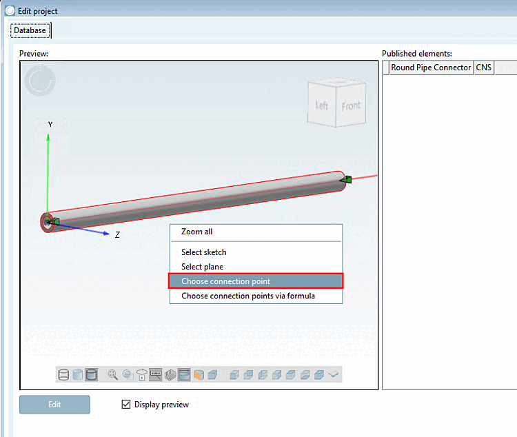 Ou sélectionnez le point d'attache souhaité dans l'aperçu (le point est alors marqué en rouge) et cliquez sur la commande Point d'attache [Connection point] du menu contextuel.