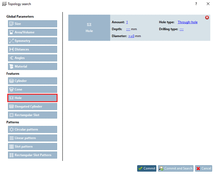 Click on the condition "Hole", under Amount, enter "1" and under Hole Type "Through-hole".