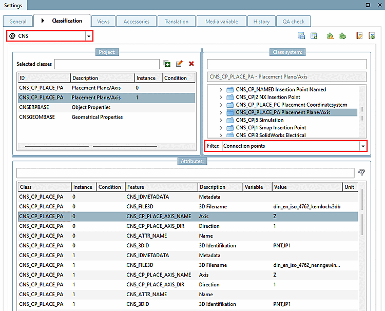 Il existe différentes possibilités de sélection pour la classification CNS. L'option points d'attache [Connection points] est particulièrement utilisée.