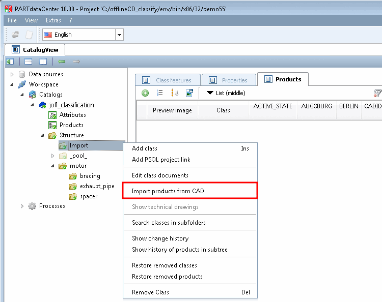 Dans la vue arborescente [Structure], sélectionnez le répertoire d'importation et cliquez sur la commande Importer des produits de CAO [Import products from CAD] dans le menu contextuel.