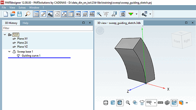 -> Dans l' historique 3D [3D History], le sketch est maintenant affiché comme courbe de guidage.
