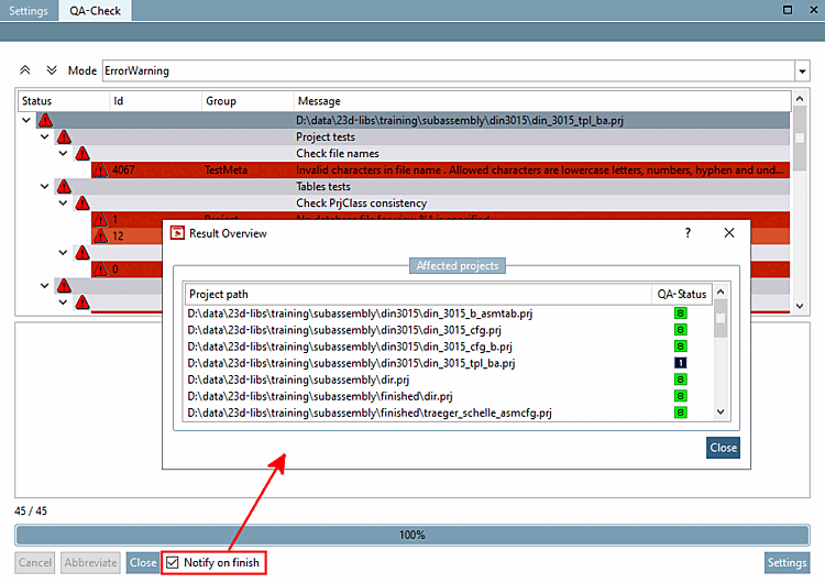 Dès que le test est terminé, une fenêtre popup s'ouvre avec une liste des projets concernés.