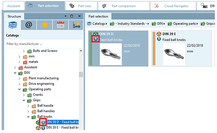 Les pièces classées comme pièces standard sont d'une part regroupées dans le PARTdataManager sous la classification standard, mais d'autre part également marquées d'une icône, de sorte qu'elles sont également rapidement visibles lors de la navigation dans les catalogues. En outre, une recherche peut être directement ciblée sur celles-ci. Comparer également Section 3.1.15.3.1, « Icônes de classification » in ENTERPRISE 3Dfindit (Professional) - Utilisateurs.