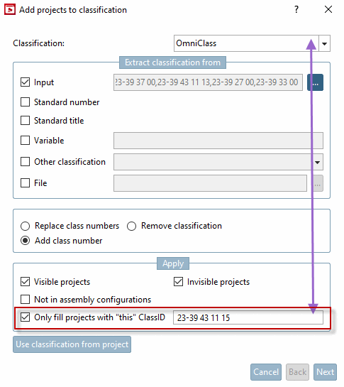 Dans la boîte de dialogue Ajouter des projets à la classification [Add projects to classification], la zone de dialogue Appliquer a été ajoutée avec de nouvelles options de filtrage. De plus, il est désormais possible de supprimer des classifications (et de restreindre également la suppression).
