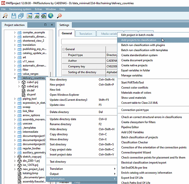 Sélectionnez un répertoire dont vous souhaitez appliquer la classification aux projets et cliquez sur la commande Ajouter des projets à la classification [Add projects to classification] du menu contextuel sous Automatisation [Automation].