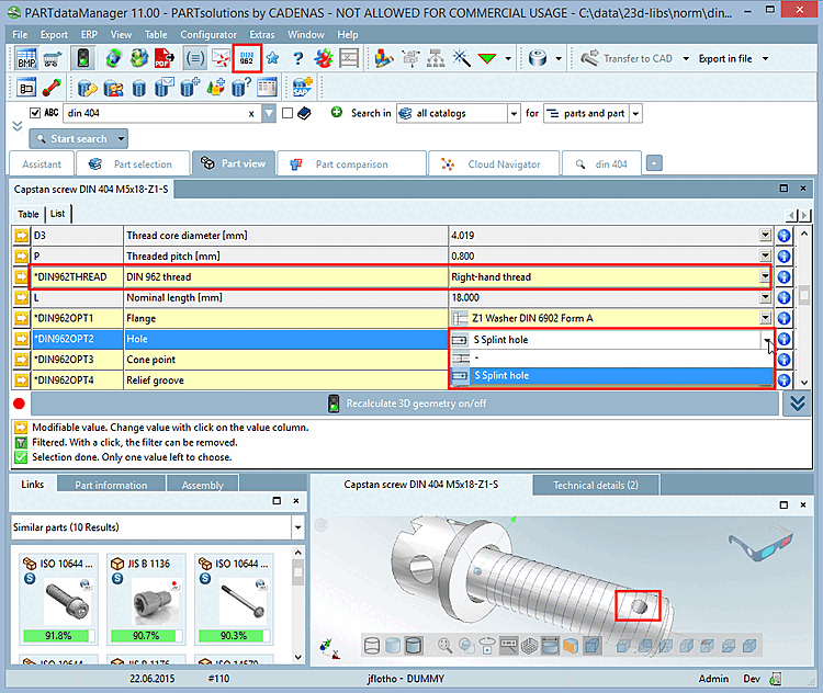 Dans PARTdataManager -> Part view, le tableau contient donc les colonnes supplémentaires DIN962OPT1, DIN962OPT2, DIN962OPT3 et DIN962OPT4. Si cette fonction est désactivée, les colonnes correspondantes ne sont pas affichées.