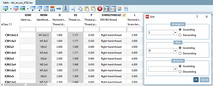 Dans PARTdataManager, le tri peut être déterminé individuellement au moyen des touches fléchées au-dessus de chaque colonne du tableau. En cliquant sur Annuler le tri [Remove sorting], on revient au tri par défaut tel qu'il a été défini dans PARTdesigner.