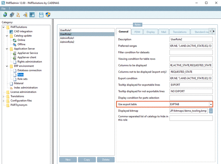 Now switch to PARTadmin and insert the before applied table name in the Use export table field using the respective role in the category tree.
