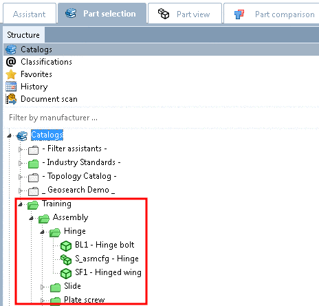 Now in PARTdataManager in the Part selection the "Training" catalog with all sub-directories will display in green color, though it possibly doesn't contain any parts, which have an ERP_PDM_NUMBER.