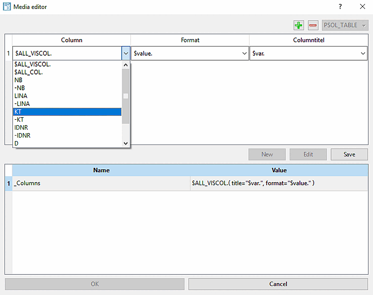 La sortie des colonnes et des valeurs dans les tableaux est contrôlée par des variables média. Dans l' éditeur média [Media editor], il est fait référence à la variable indiquée dans PARTtemplateDesigner.[120]