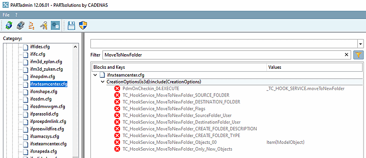 IfProeTeamcentermagasins d’abord l’élément dans le dossier donné par la touche de configuration TC_TmpFolder, qui par default est le dossier Newstuff de l’utilisateur actuel. C’est là que l’objet se trouve actuellement.La clé TC_TargetFolder est appliquée (l'élément est déplacé) dans EndCheckinTransaction, qui est exécutée après Checkin1 (PdmOnCheckin_XX). Dans ce cas, avec MoveToNewFolder HookService actif dans PdmOnCheckin_01, vous essayez de déplacer la pièce de TC_HOOKSERVICE_MOVETONEWFOLDER_SOURCE_FOLDER=Home/QA/GOHR/CREO à TC_HOOKSERVICE_MOVETONEWFOLDER_DESTINATION_FOLDER=Home/QA/3DFindIT. Cela ne peut pas fonctionner, car l'élément est toujours dans le TC_TmpFolder (dans ce cas Newstuff).