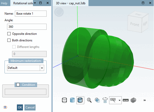 Fenêtre d'ancrage Corps de rotation [Rotational solid]: Dans le champ de saisie Angle, conservez la valeur par défaut de 360° comme angle de rotation [Rotation angle].