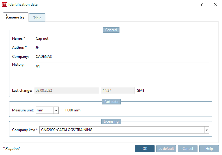 Remplissez les champs obligatoires Nom du composant [Part name], Auteur [Author] et Clé de l'entreprise [Company key].