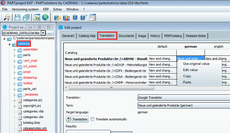 The translation of Release Notes inside of PARTproject has been optimized with version 9.07. Once the catalog itself is selected on the left side in the tree and the Translation tabbed page in the Edit project window on the right side, the single release notes are listed.
