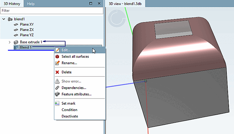 Dans l' historique 3D [3D History], vous pouvez utiliser la commande de menu contextuel au-dessus de la fonction Blend en sélectionnant Editer.. [Edit...]. à tout moment.
