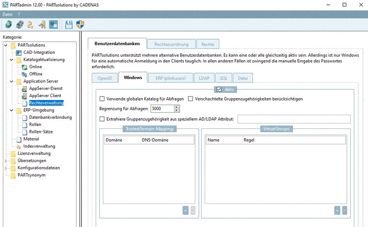 In general, all Windows users and groups can be displayed under PARTadmin -> category Rights administration -> tabbed page User databases -> tabbed page Windows. As a rule, the module PARTadmin is only available for the administration and access to DSGVO-relevant files is controlled by the Windows rights management.