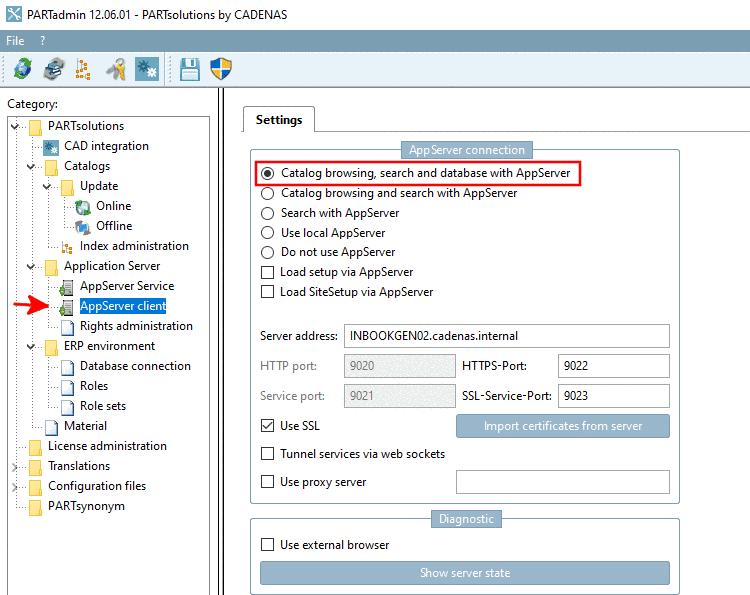 By deault, on the tabbed page Settings, under AppServer connection, the option Catalog browsing, search and database with AppServer is set.