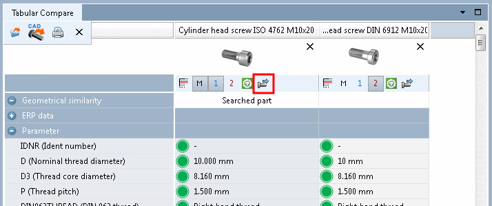 Dans la zone Ligne de sélection pour les projets sélectionnés [Select project line], vous voyez les tableaux des caractéristiques de la pièce recherchée et de la pièce à contrôler. Vous trouverez des informations détaillées sur la comparaison des pièces sur Section 1.3.10, « Comparaison des éléments de construction ».