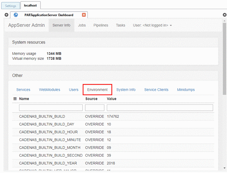 Environment: All environment variables of the server are displayed; for example CADENAS_DATA or CADENAS_LICENSE.