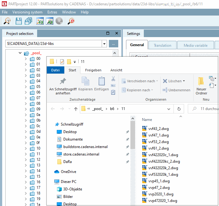 Répertoire des médias [Media directory]: Les fichiers (dxf/dwg) sont copiés du répertoire indiqué dans le dossier du pool et les liens correspondants sont générés en conséquence.