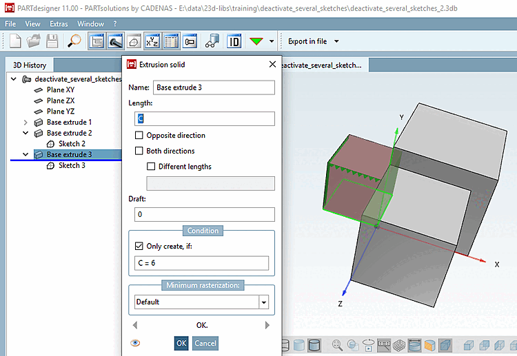 .Ouvrez Base extrude 2. La condition non valide "0=1" a été insérée.
