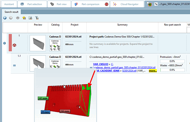 -> Les résultats de la recherche sont listés. La colonne Recherche de pièces brutes [Search for unmachined parts] montre le dépassement [Protrusion] et les chutes [Waste]. Dans l'info-bulle, les chutes sont marquées en rouge.