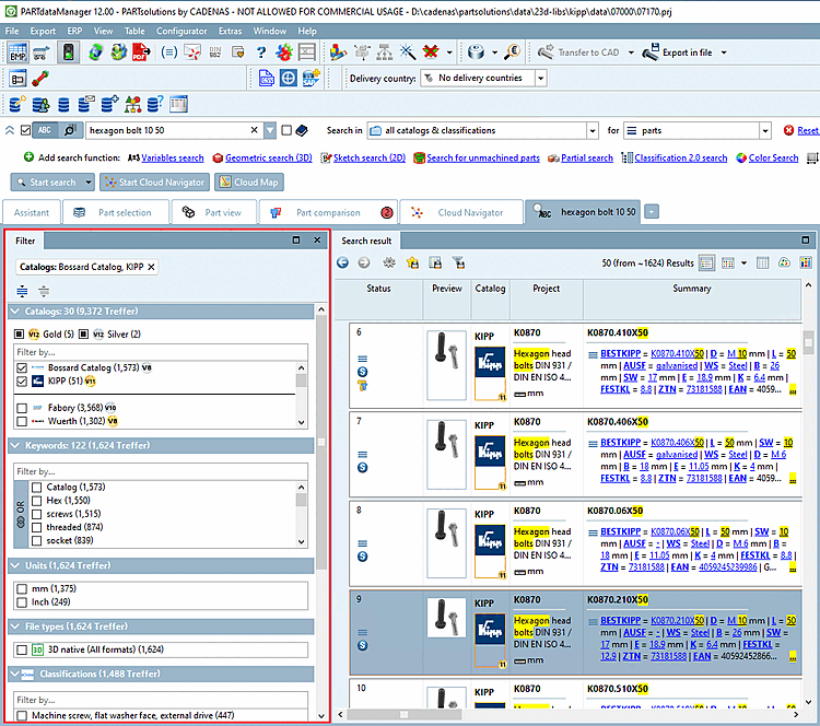 Remarque Il est en outre possible de filtrer selon des caractéristiques géométriques. Dans la version standard, il s'agit de la plus petite, moyenne et grande dimension ainsi que de l'épaisseur du matériau. Les administrateurs peuvent créer d'autres filtres dans les fichiers de configuration ou modifier les filtres existants. Voir à ce sujet : Manuel d'administration PARTsolutions, chapitre 6.5.19