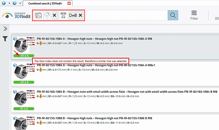 Dans les catalogues de fabricants, les produits ne sont pas indexés sur toutes les lignes du tableau, mais seulement sur 1% des lignes du tableau ou sur au moins 3 lignes (la première, la moyenne et la dernière). Si l'on utilise la recherche de photos, seules ces lignes sont affichées en priorité dans les résultats. Mais si l'on combine la recherche de photos, par exemple avec la recherche de texte ou de variables, les lignes spécifiées avec précision sont affichées ; la valeur de similitude géométrique n'est cependant pas réelle, mais c'est la valeur de similitude de la ligne la plus proche de la recherche de photos qui est affichée. Vous le reconnaissez au symbole tilde et, au survol de la souris, aux informations de l'info-bulle.
