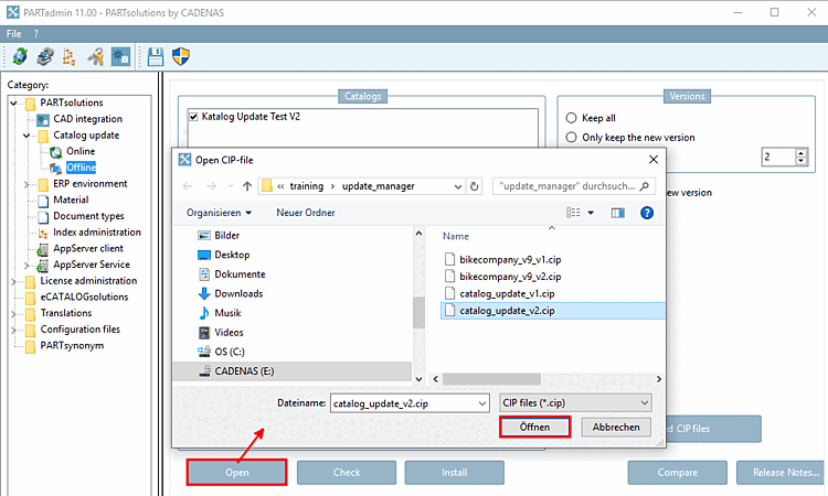 Par défaut, une mise à jour du catalogue est mise à votre disposition via PARTadmin -> Catégorie Mise à jour du catalogue [Catalog update] -> En ligne [Online]. Dans la mesure où vous disposez de la mise à jour sous forme de fichier CIP, vous pouvez également choisir la variante hors ligne.