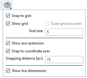 S'accrocher aux axes de coordonnées [Snap to coordinate axes]: Si, par exemple, l'option Enclencher sur la grille [Snap to grid] est désactivée mais activée, une ligne s'oriente strictement sur les axes de coordonnées, la longueur restant libre, contrairement à l'option Enclencher sur la grille [Snap to grid].