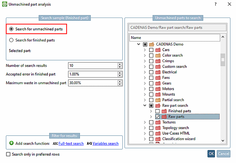 Cet exemple utilise la recherche de pièces brutes [Search for unmachined parts]. Vous trouverez des informations détaillées sur les options de configuration sur Section 3.1.13.3.1, « Dialogue "Analyse des pièces brutes" : options de réglage ».