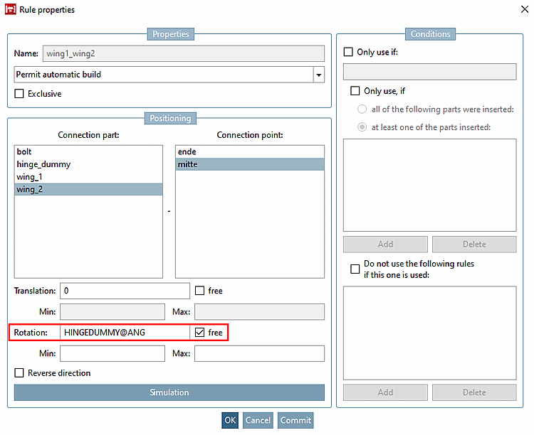 Sous pièce jointe [Connection part], sélectionnez "aile1" et sous point d'attache [Connection point] "milieu".