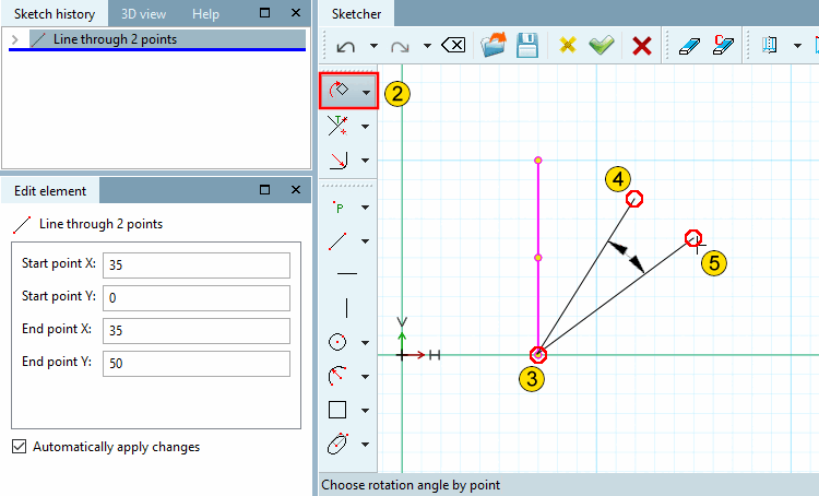 -> Dès que vous avez fixé le deuxième point, l'élément pivote immédiatement de l'angle formé par les deux lignes.