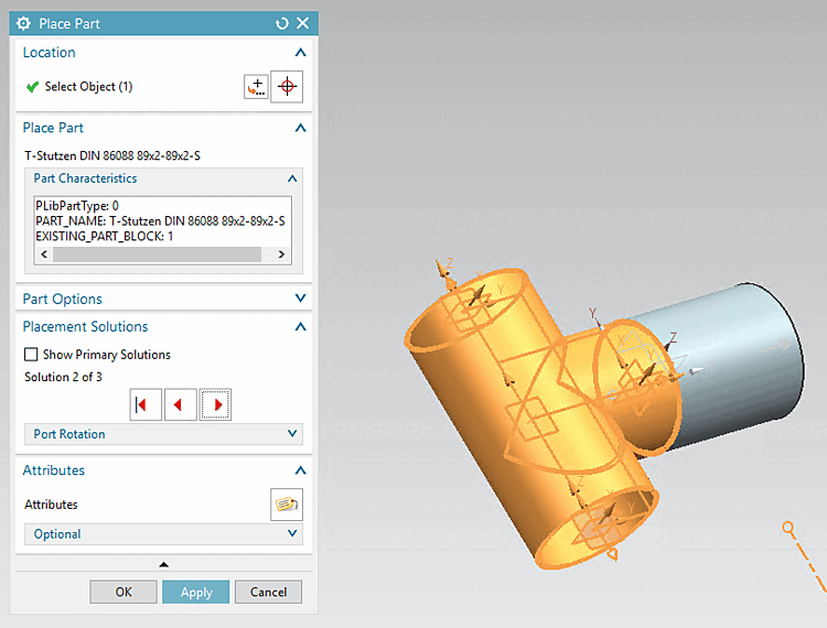 Ce qui suit décrit comment insérer un composant PARTsolutions avec des moyens NX standard. Ici, dans l'exemple, la pièce insérée est reliée à une pièce créée manuellement (voir Section 5.12.11.6.1, « Construction de pièces dans NX à l'aide d'une structure de chemin et d'une fonction "stock". »).