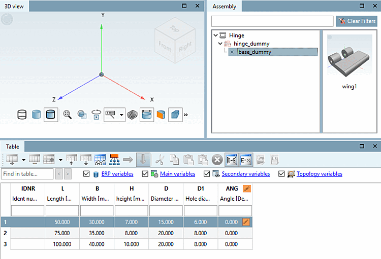 Cliquez sur la désignation de l'assemblage dans la fenêtre d'accueil Structure [Assembly] (ici, dans l'exemple, "Charnière").
