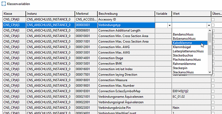 L'illustration suivante montre (encadré en rouge) les propriétés de connexion actuellement disponibles (Electrical Connection = CNS_CP|4|3 ) appelées sous PARTproject -> Extras Menu -> Systèmes de classes : Editer.. [Class systems: edit...].