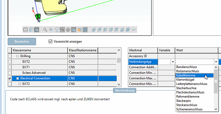 Pour les composants qui ont déjà été classifiés par le fabricant selon eCl@ss, les informations peuvent être mappées sur la classification CNS. Sinon, les données 3D dans PARTsolutions (points d'assemblage classifiés comme connexions électriques) doivent être munies d'informations supplémentaires provenant de la fiche technique.
