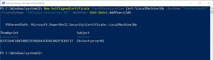New-SelfSignedCertificate -CertStoreLocation Cert:\LocalMachine\My -DnsName "testserver01" -FriendlyName "3dfindit-testserver-01" -NotAfter (Get-Date).AddYears(10)