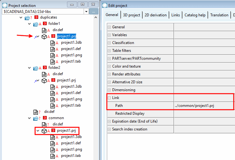 La fonction Nouveau lien [New link] est également la meilleure solution lorsque les projets ont été créés en tant que véritables doublons physiques. De tels projets provoquent un message d'erreur lors du contrôle QA [QA check], car la désignation de la norme ne peut pas être la même pour différents projets. Voir Section 6.8, « messages d'erreur : Problème - Solution (PARTproject) » -> Point "Le projet a la même désignation de norme".