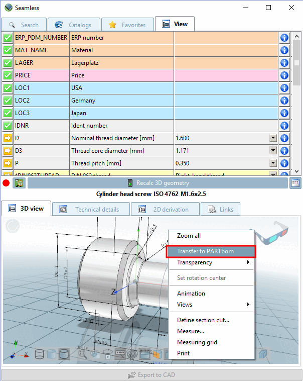 Par défaut, la commande Envoyer à PARTbom [Transfer to PARTbom] est masquée (il y a donc une entrée de config).