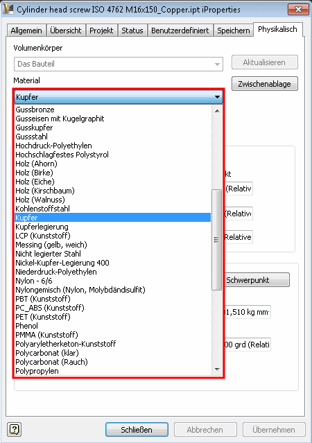 Vous pouvez également exporter une pièce vers Inventor, y appeler les iPropriétés et vérifier ici, sur la page d'onglet "Physique", quels matériaux sont disponibles dans la zone de liste et obtenir la désignation exacte à cet endroit.