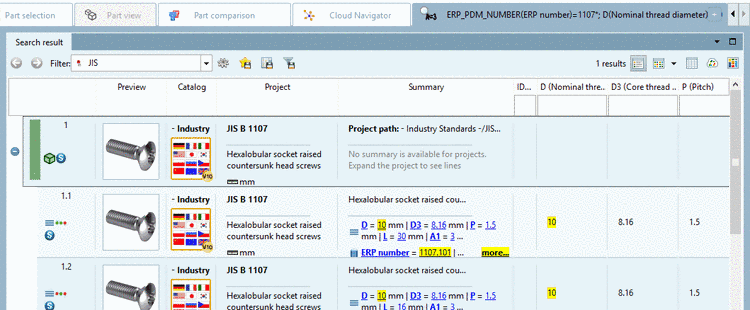 Furthermore the common geometrical variables of a selected directory level are displayed. The above figure is exemplarily showing the common variables of Norm -> JIS -> Bolts - Screws - Nuts - Washers - Screws -> Screws.